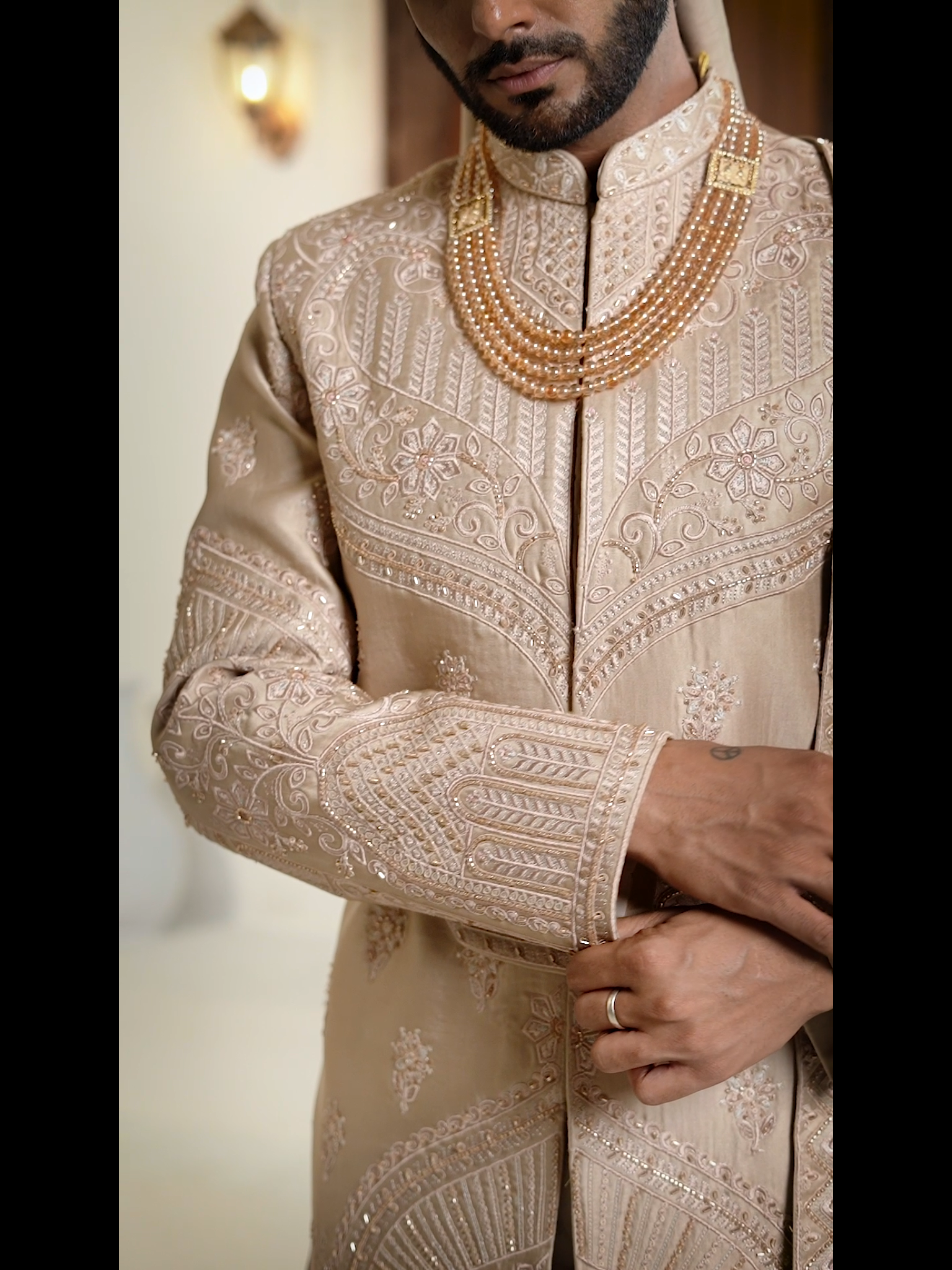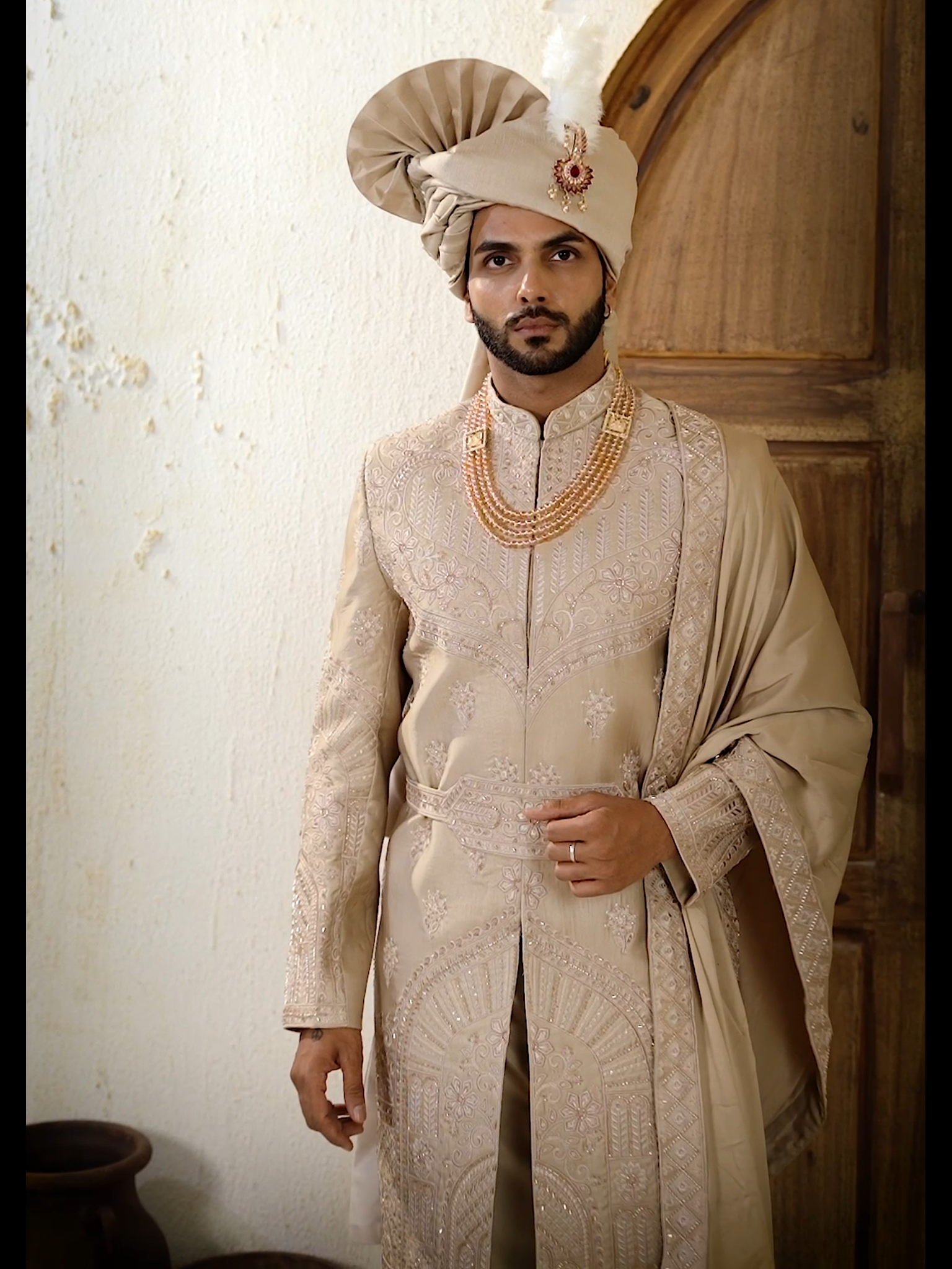 A luxurious beige embroidered sherwani