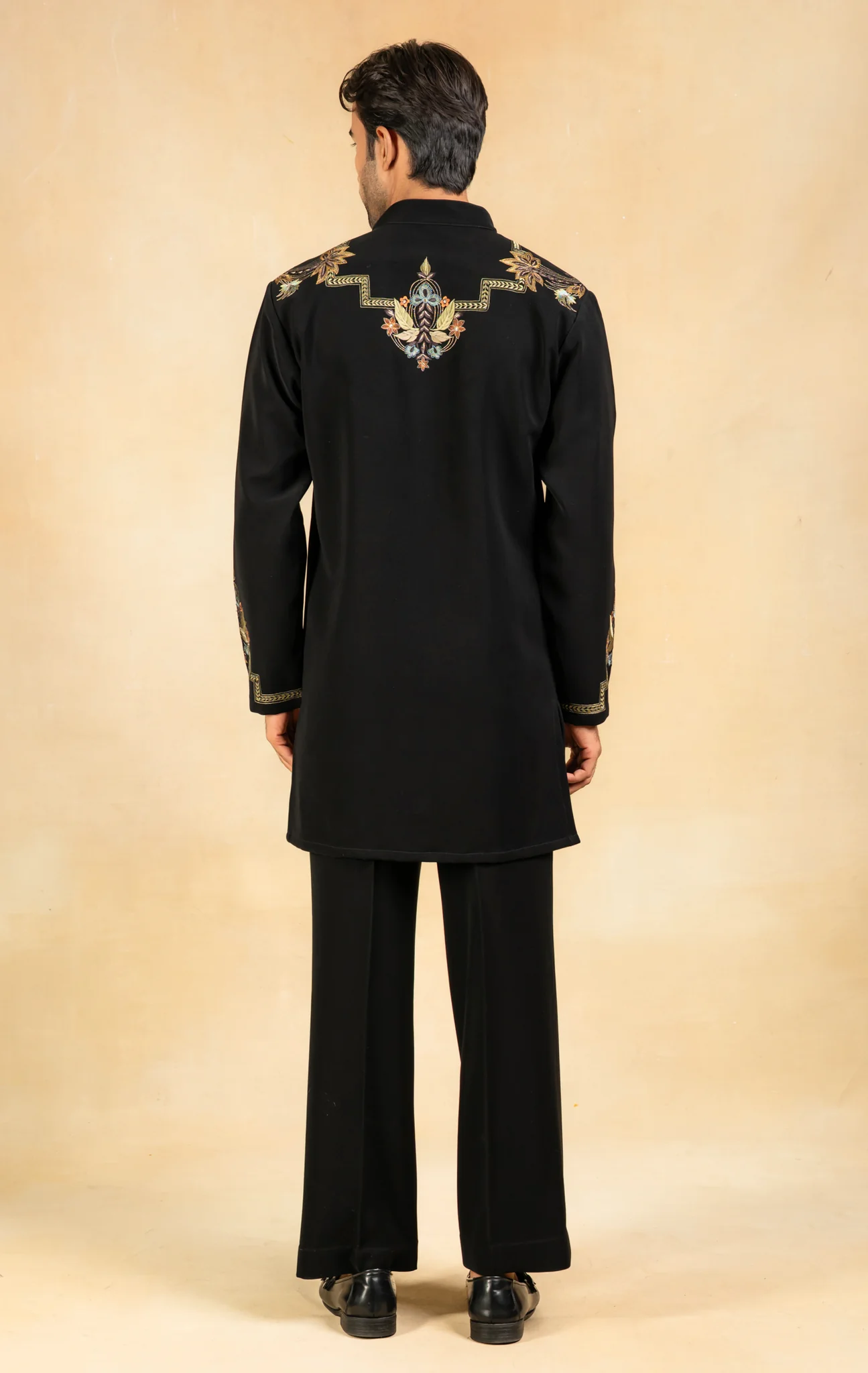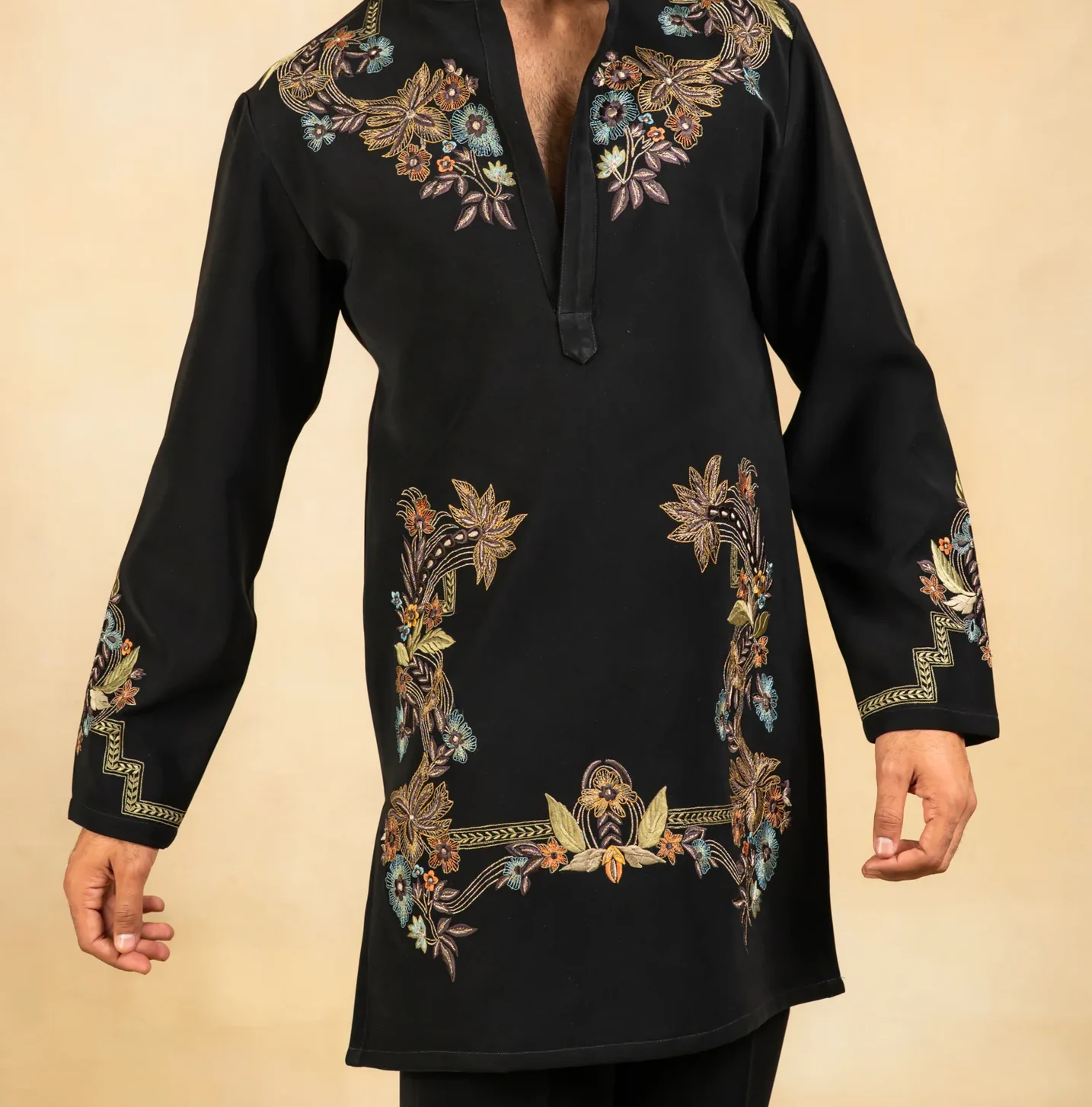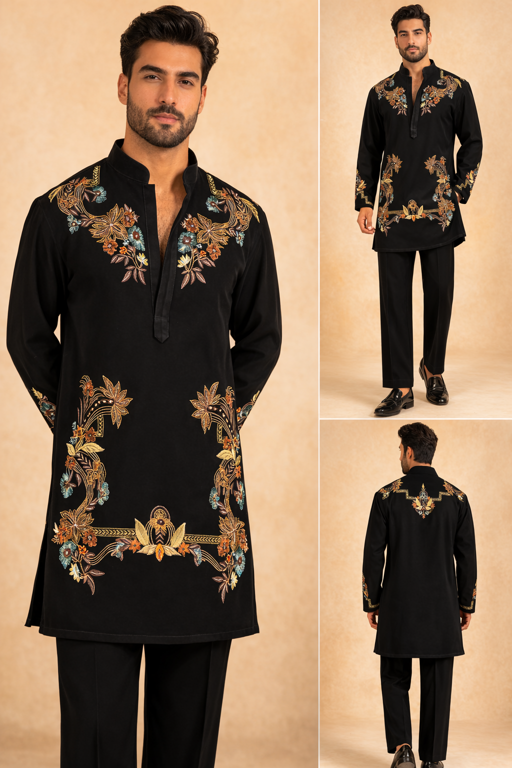 Shop premium black embroidered kurta set for men featuring elegant floral embroidery and modern design. Perfect for weddings, festive occasions and designer ethnic fashion.