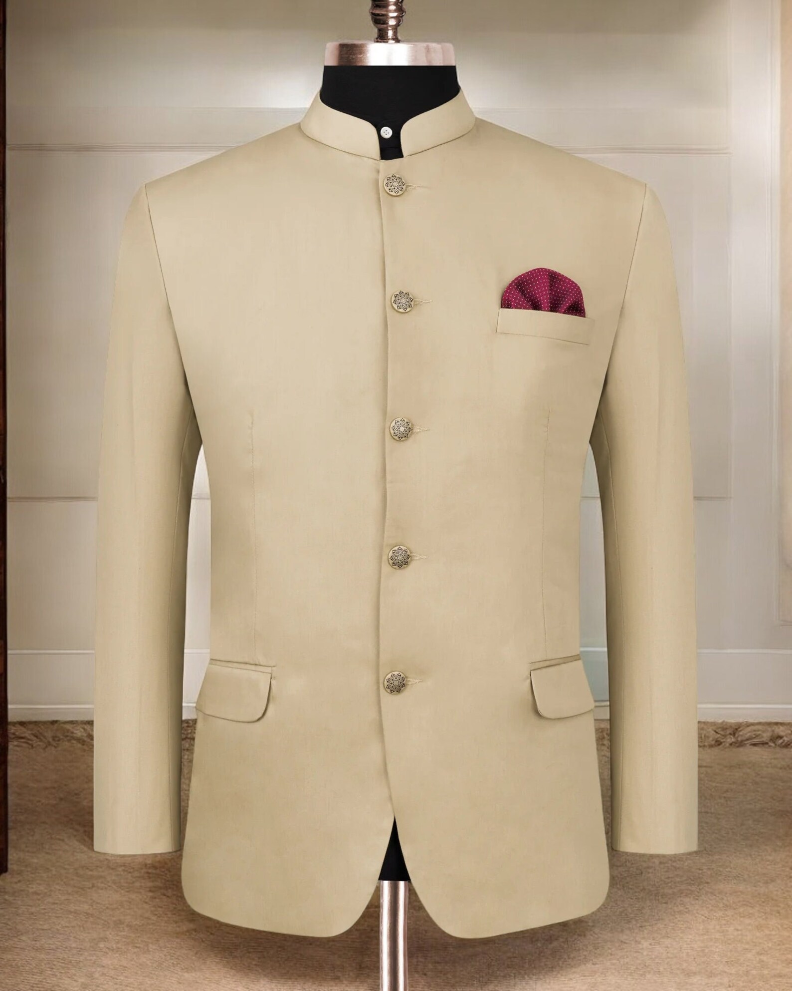 The soft ivory tone gives a royal and timeless appeal, making it a versatile choice for day and evening events. The structured silhouette enhances your physique, while the mandarin collar (bandhgala style) adds a refined and regal touch. Featuring a front button placket with intricately designed metallic buttons, this piece exudes understated luxury.